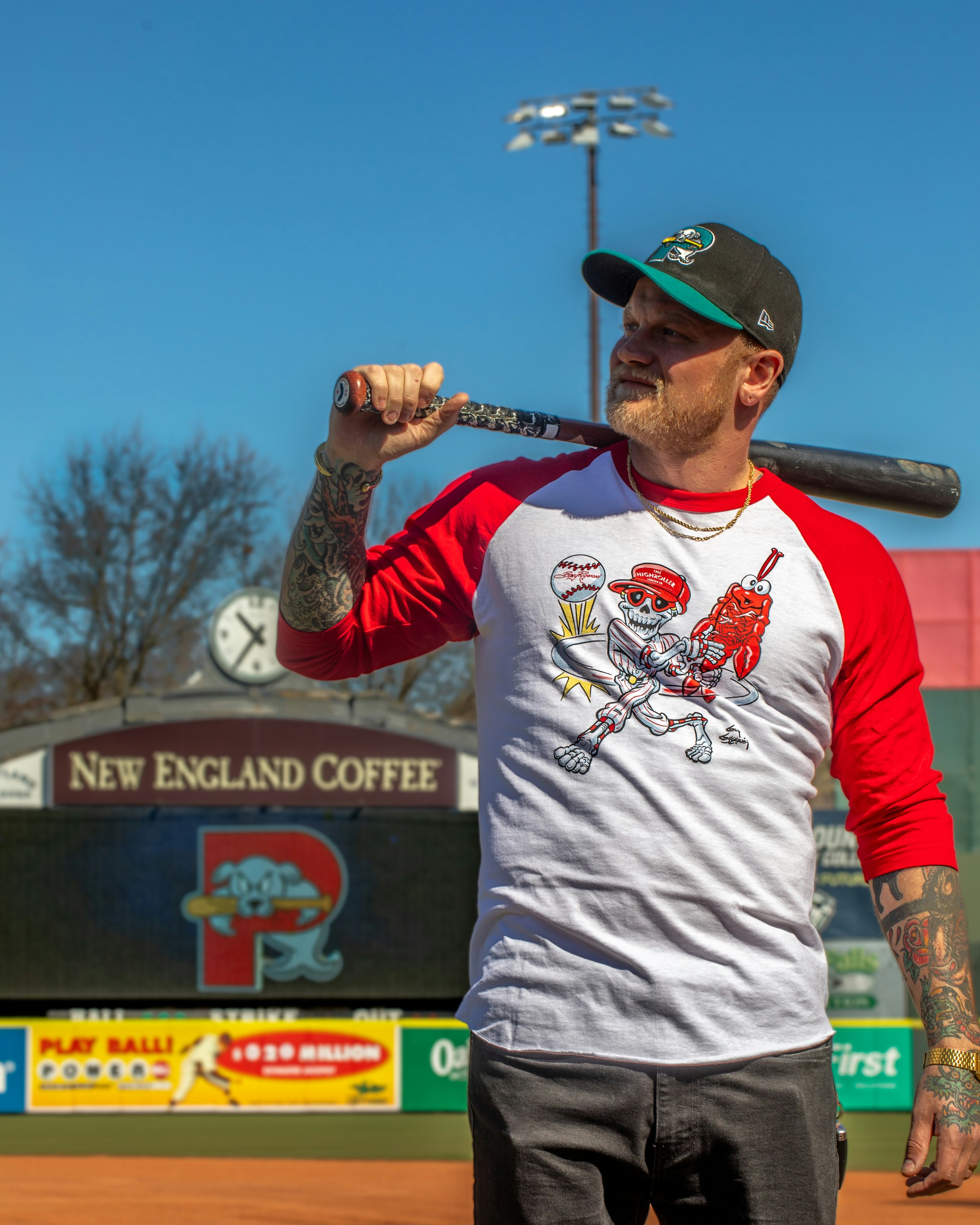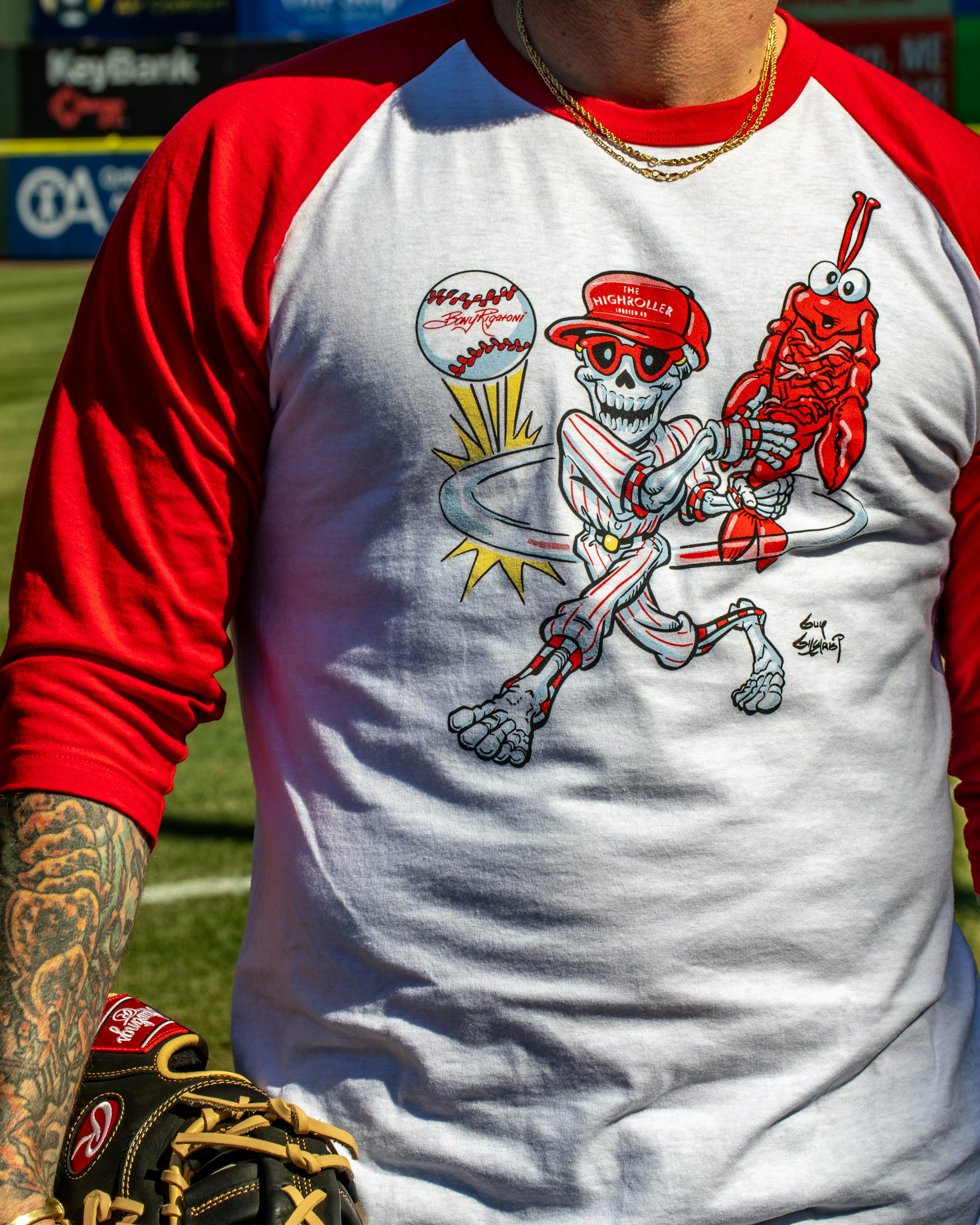 White Raglan-style T-Shirt with red sleeves. Design by Guy Gilchrist depicts Bony Rigatoni knocking a baseball outta the park using a lobster as a baseball bat