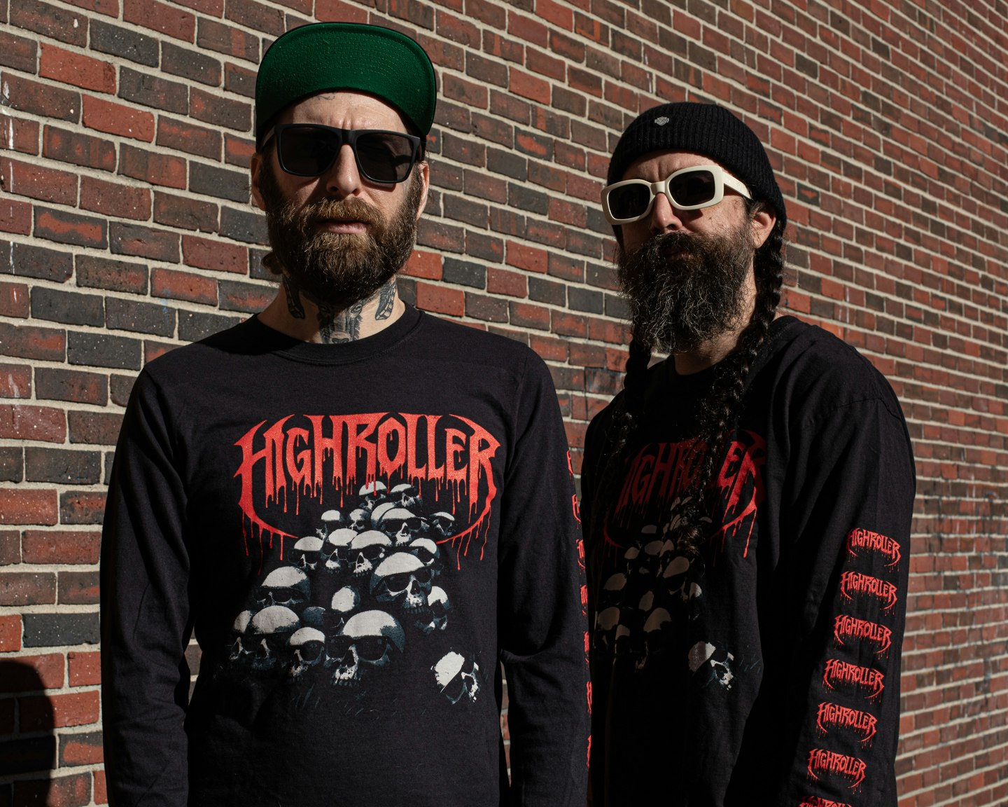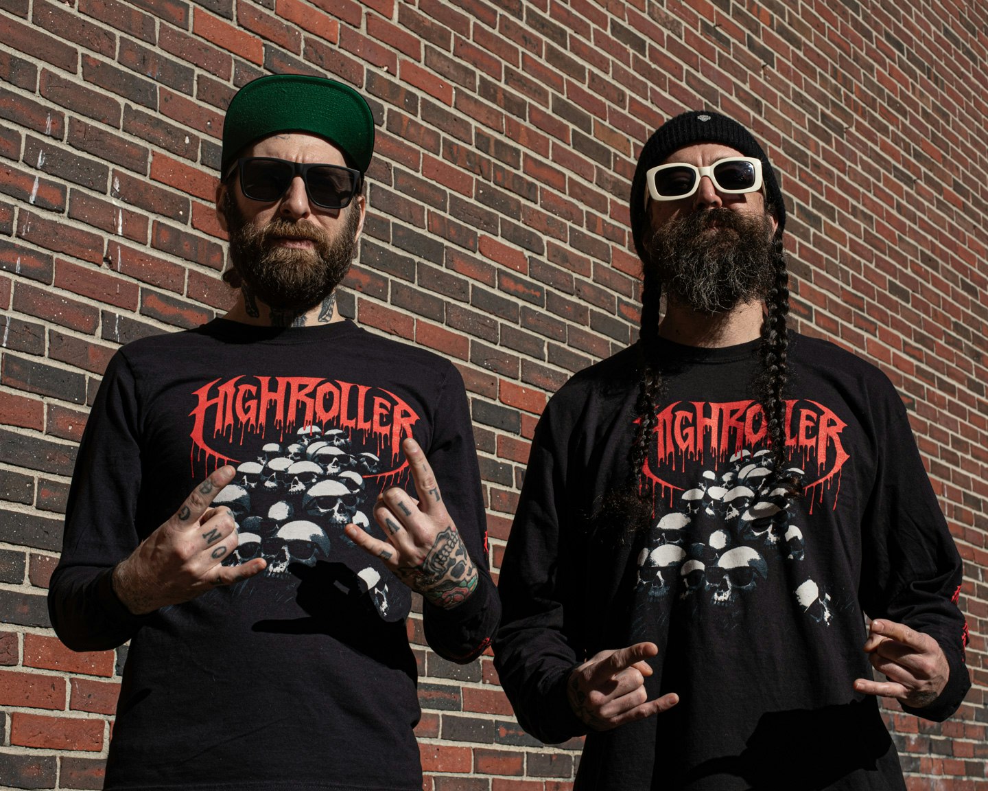 Black, Comfort Colors, Long Sleeve T-shirt featuring a stack of severed Bony Rigatoni heads emblazoned on the front, and a red, hardcore, Highroller logo across the chest and down the left arm.